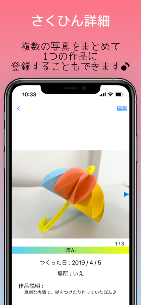 お子様の大切なさくひんを、どこで作ったか(保育園・いえ・公園など)・こどもごとに分類して、綺麗に保存するアプリです。
